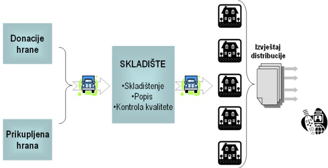 • SKLADIŠTE – sortiranje, razvrstavanje, popis i kontrola, kontaktiranje posrednika, udruga/organizacija koje se bave socijalno ugroženim stanovništvom, mjesečni i tromjesečni izvještaji nadležnom ministarstvu, mjesečni izvještaji donatorima, kontrola popisa krajnjih korisnika